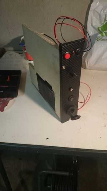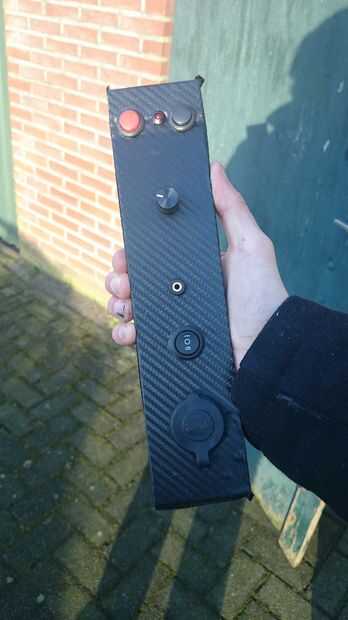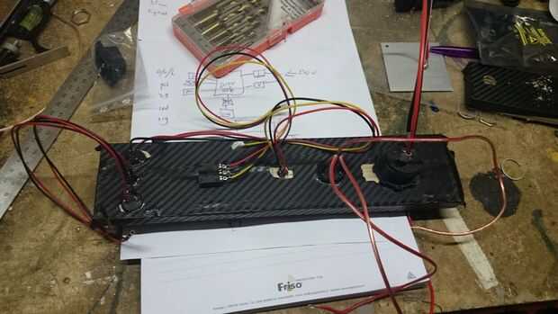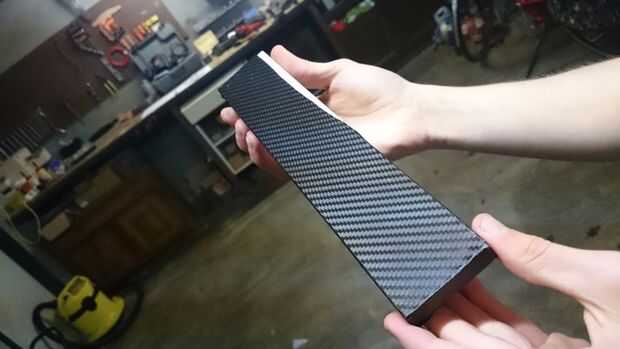 La parte delantera de nuestro compartimento electrónica será envueltas con carbono. Probamos nuestro envolvimiento en una prueba de pieza primera [4] y procedió a nuestra pieza real delantera [5]. De arriba a abajo: encendido/apagado led/perilla de volumen, entrada de 3,5 mm, LED interruptor, zócalo del cigarrillo.