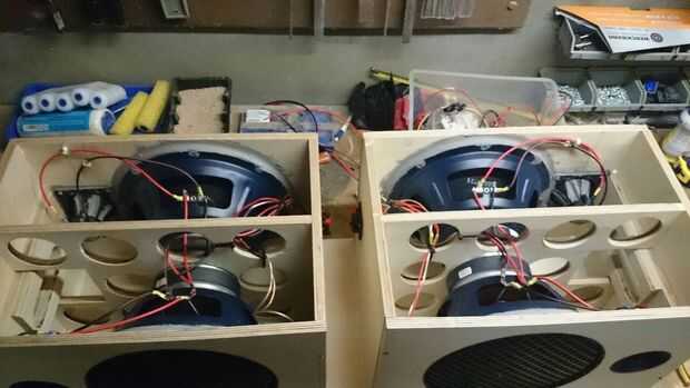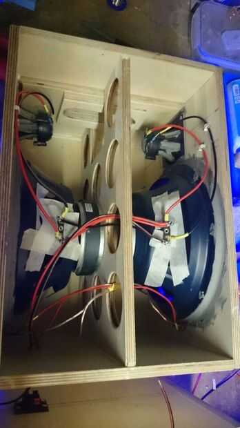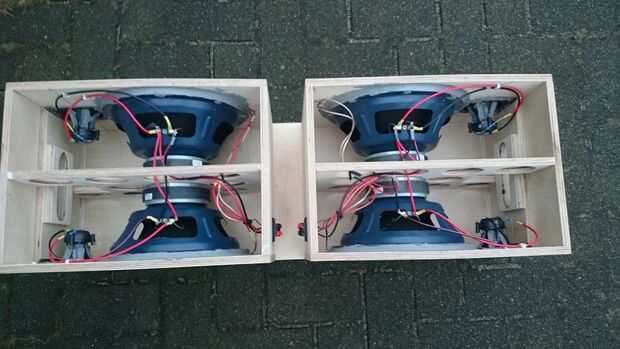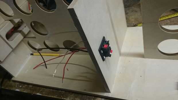La materia gris en el imán del altavoz en la figura 2 es metal química. Es muy fuerte, muy apestoso y muy química. Como se puede ver ya cableado los woofers a los tweeters. Más tarde se estar conectados en pares a los terminales que ves en la foto 3.