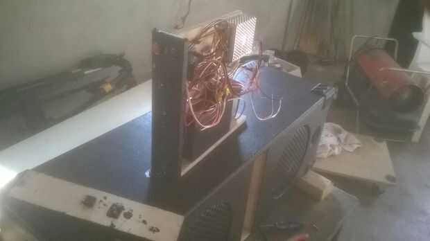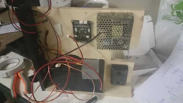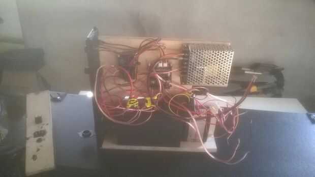 Después de un poco de testfitting hemos cableado todo. Utilizamos varios metros de cable; p. El recorte de la derecha es deslizarse sobre los terminales. Funcionó perfectamente al final. La parte trasera con la entrada de 230v, tira de LED controlador sensibilidad perilla y nombre de la placa en él sellaba el compartimento. Está atascado allí como se puede ver.