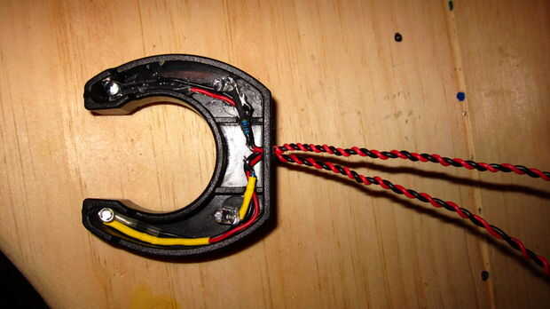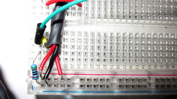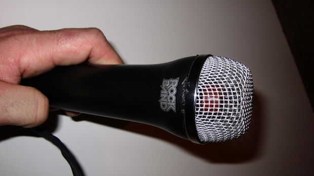 Retirar y examinar el cable. No de 4 cables, no hay ayuda para nosotros-lanza a un lado. Las partes no eléctricas del rockband mic le dan una agradable sensación pesada así que quería mantenerlas. El MQ-3 ajuste convenientemente dentro de la cubierta de goma para el micrófono de electret. Asomó entonces un agujero a través de la parte inferior de caucho para alimentar mis cables por MQ-3. El sensor tiene 6 conductores. Vamos a utilizar 4. El sensor es reversible por lo que no importa la alineación. 4Long cables (resistencia desconocida) van al circuito independiente. Se lee el sensor entre el cable amarillo y la resistencia a tierra.