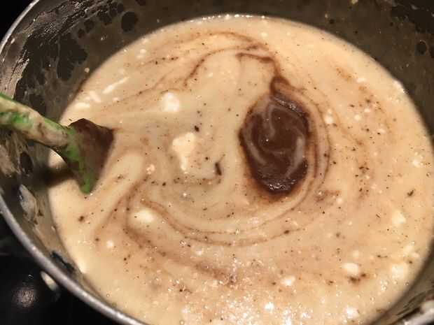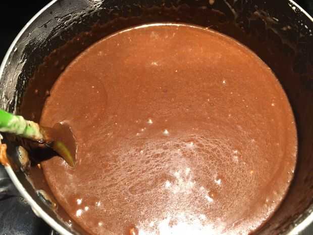 Después de 5 minutos de ebullición, vierta los chips de chocolate y vainilla en la olla y retirar del fuego. Remover rápidamente para asegurar el chocolate se derrite completamente.