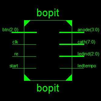 Esto muestra el archivo bopit.vhd. Es la unidad central para todo el programa. Cada programa que dará que hablar se conecta a este archivo. También la máquina de estados finitos reside en este archivo.