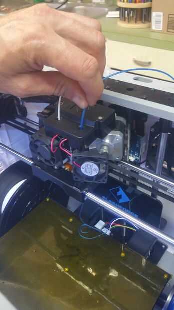 Ahora quiere probar que no hay nada bloqueando la boquilla. Para ello, actuando como su propio "émbolo". Tome su filamento y cuidadosamente la shove en el orificio en la boquilla a través de los orificios de alimentación. Si todo es bueno, a ver streaming fuera de la base del filamento.