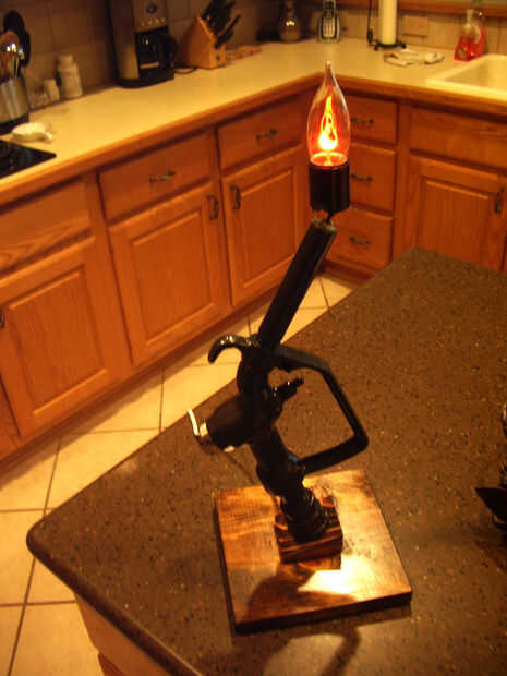 Los materiales utilizados para este proyecto incluyen un inyector de gas viejo, portalámpara, cable de la lámpara e interruptor, un vástago roscado de la lámpara y tuercas, trozo de cobre de la tubería, pegamento del gorila, imprimación, pintura, madera y varios tornillos de madera. También utilicé imprimación, pintura, tintes y barnices.