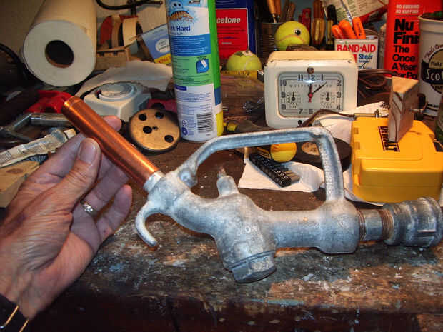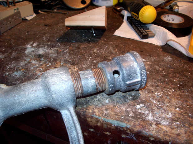 Mi plan era montar la boquilla a una base de madera, así que corte un tapón de madera y pegadas en la parte inferior montaje (foto 4). Esto me permitiría acumular un tornillo de la base de la lámpara para fijar la boquilla a la base.