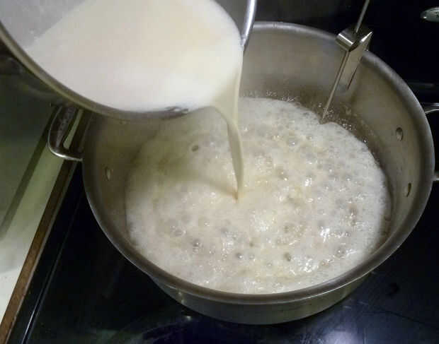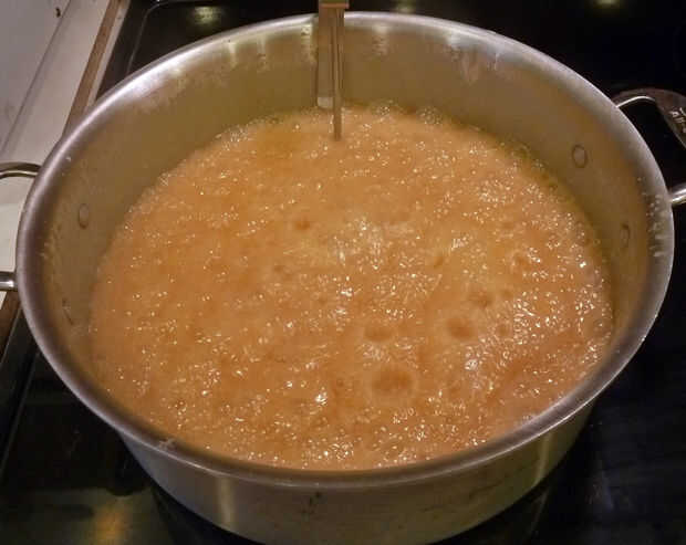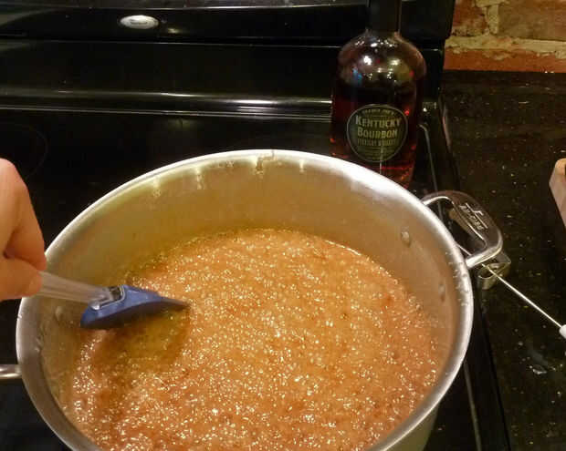 Cuando el caramelo haya alcanzado la temperatura, agregue el bourbon hasta bien combinado,