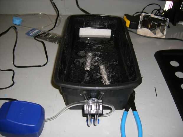 Ejecutar el tubo en el almacenamiento de tote y conéctelas a las piedras de aire y la válvula de dos vías. Conecte la bomba a la válvula. Poner en agua del enchufe de la válvula y ver las burbujas bastante.