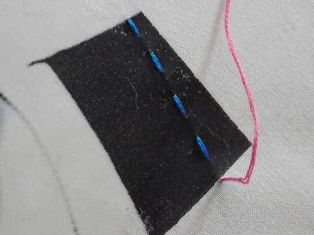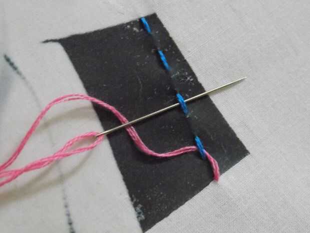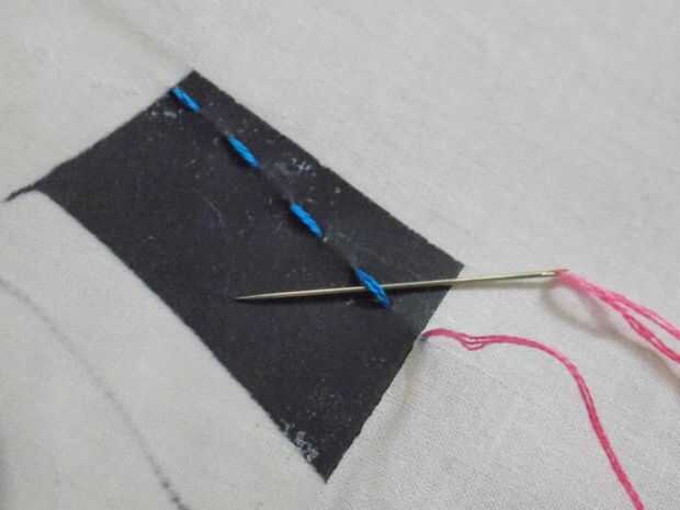 Tejido de la aguja bajo su primera puntada corriente de la derecha.