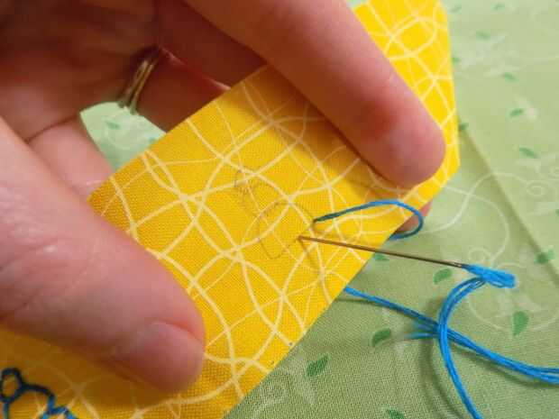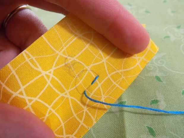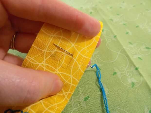 Inserte la aguja en su línea de frente sobre un 1/4" de donde empezaste.