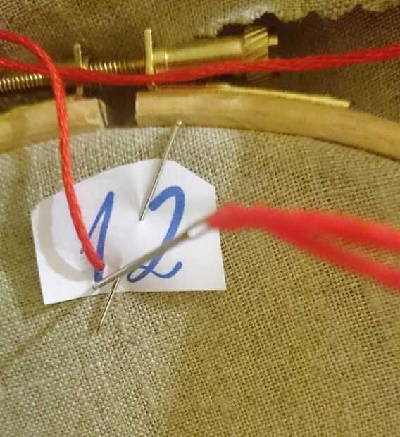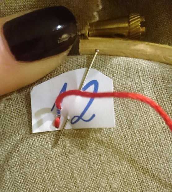 Corte una longitud del hilo rojo, nudo uno de los extremos y el hilo la aguja. No que tu hilo demasiado largo si no se enreden. No hay nada que odio más que enhebrar las agujas así que traté de ser inteligente y una pieza extra larga de hilo que enredado después de mi tercera puntada del hilo de rosca. Después de tratando de arreglar y continuando en eventualmente tuviera que elegir mis puntadas hacia fuera! Es cierto lo que dicen de intentar cortar esquinas.