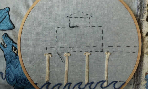 Puntada es simplemente relleno en un área de tejido con hilo estableciendo una puntada inmediatamente al lado de otro. Esto es donde tener una buena armadura medio el tejido se vuelve útil. En este ejemplo, estoy llenando en el edificio en el muelle con puntadas; puesto que es una estructura de madera, quiero mis puntos para ver como tableros rectos, por lo que estoy cuidando de seguir los hilos de la tela al realizar cada puntada.