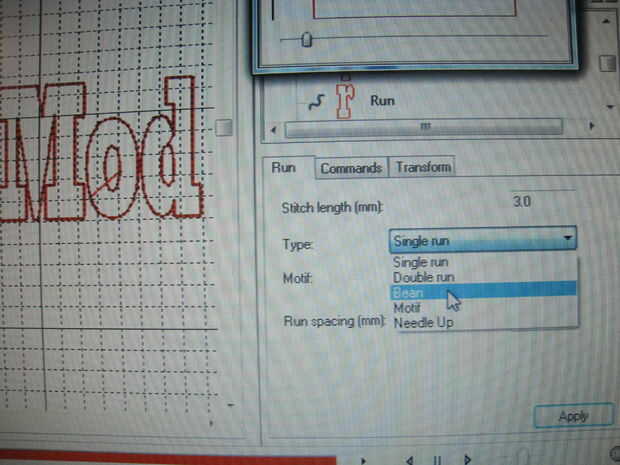 8. así que su arte es puntadas ahora pero usted no está listo para coser aún. PODRÍA coser ahora pero su línea de la puntada sería difícil de ver ya que es sólo una línea básica de costura alrededor de cada letra. Es necesario intensificar un poco así que vamos a cambiar esas puntadas "funcione solo" a puntadas "haba". "bean" costura es dos puntadas al lado para hacer una línea de puntadas más audaz. Así que seleccionar el "frijol" opción de puntadas y "aplica" a costura resaltada en la pantalla.