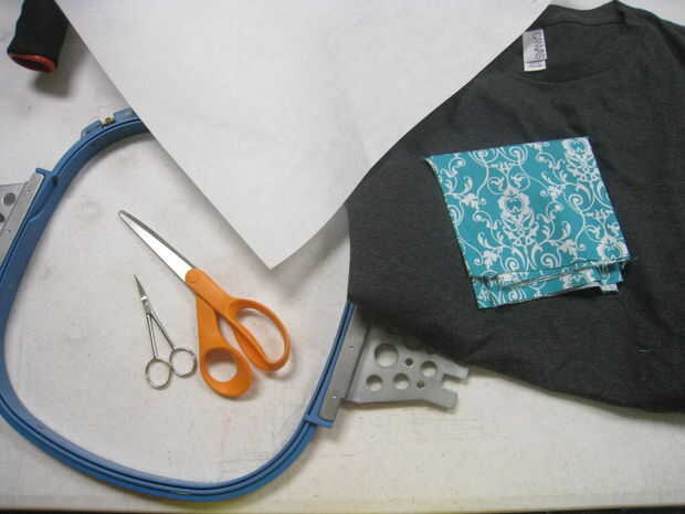 2. Coloque el aro con estabilizador dentro de la camiseta y conseguirlo en la zona que lo quieres coser y coloque cuidadosamente la pieza de tela sobre la parte superior. Tire de la parte superior de la camiseta hacia abajo y alisar las arrugas tanto en la camiseta y la tela por debajo.
