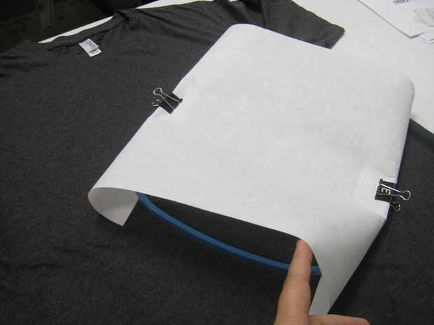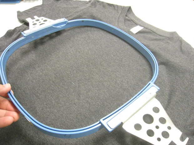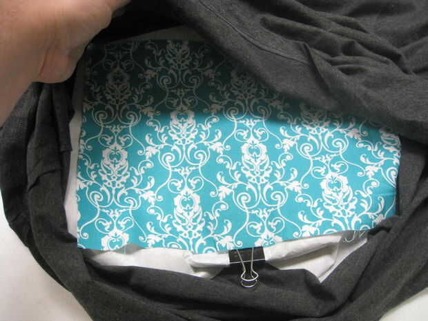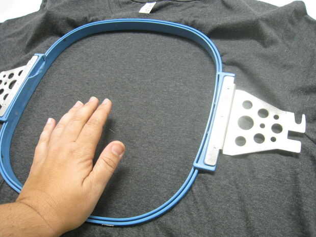 1. Envuelva una hoja de corte estabilizador en la parte inferior dentro de la porción de su aro (la parte que estará dentro de la prenda cuando aros) y los clips de oficina para mantener al aro. Esto lo hago puedo entrar todo en la camiseta sin mucha provocación del cambio, y porque no llego a tener una Junta de lujo hooper que sostiene el todo mientras aro.