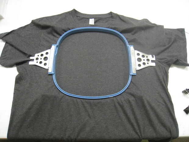 6. la prenda es ahora aros y listo para bordar. Este es un buen momento para Compruebe que su aro es recta, incluso en todos los lados y que cose su diseño donde quieres hacerlo. ¿Es demasiado baja? ¿demasiado alto? ¿demasiado a la derecha? Si es así unhoop, ajustar y rehoop. Si su aro está torcido su diseño va a ser torcido. Simple como eso. :)