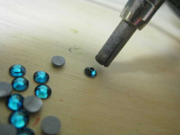 Que el cristal se sientan en la punta de la plancha para un segundo para que el calor puede derretir el adhesivo que es en la parte posterior de la caliente del arreglo cristalino. Usted sabrá que está listo cuando el adhesivo en la parte posterior se convierte en brillante e incluso o comience a "burbujear para arriba"