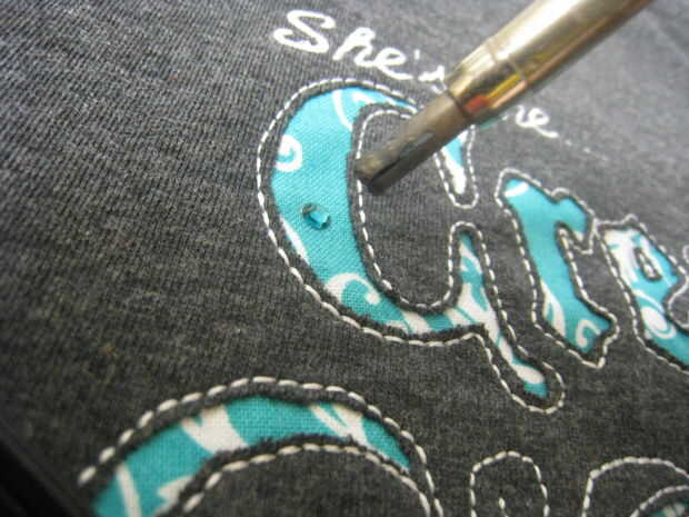 Ahora el punto a que el bebé en el lugar donde desea el cristal en su diseño y de la punta de la plancha con el cristal a la camisa y tire hacia arriba. El hierro llegará lejos dejando el cristal adherido a su diseño.