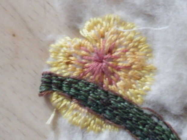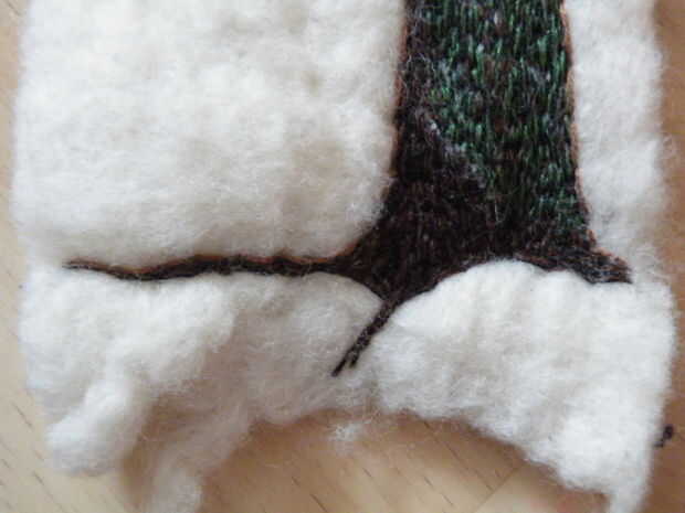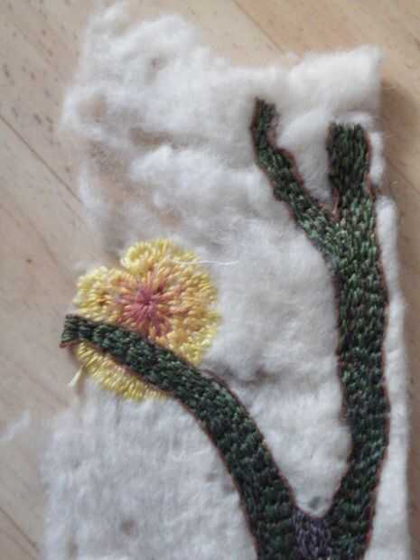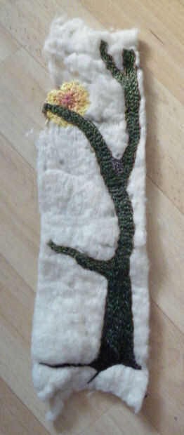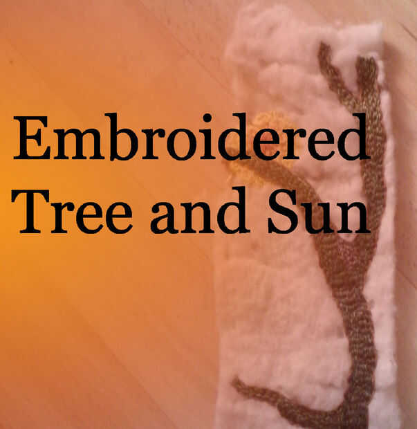 En la última pieza, el sol no fue bordado, pero era una pieza deliberadamente desigual de algodón fino, que he pintado en pinturas a base de agua que corría y se fusionó en uno al otro y luego appliquéd en el fieltro, antes de bordar el árbol en verde y marrón hilo.