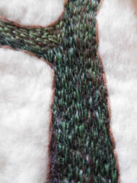 Dibujó el contorno del árbol en una hoja de papel y luego coser el contorno para transferir el diseño al fieltro. Rasga el papel, luego "de color" el árbol con hilos pares de verde y marrón para simular la textura y el color de un árbol.