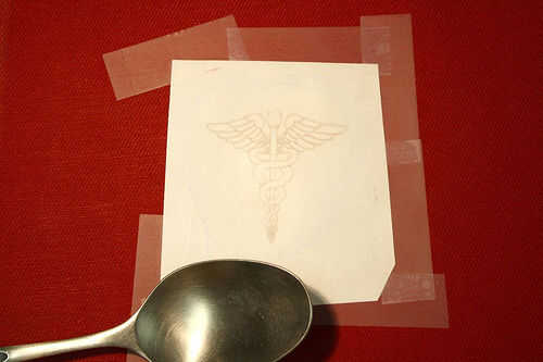Usando una bola de algodón aplicar la acetona en la parte posterior del papel, solo basta que se puede ver a través del papel. Aplique una presión firme y frote el papel con la parte posterior (no borde) de una cuchara. Frote de izquierda a derecha por un tiempo y luego cambiar para arriba y abajo. Usted quiere asegurarse de que el papel no se mueva en relación con la tela y no quieres que el papel tan mojado que rasga. Se superponen las áreas que están frotándose con la cuchara, usted quiere asegurarse de que no te pierdas un lugar.
