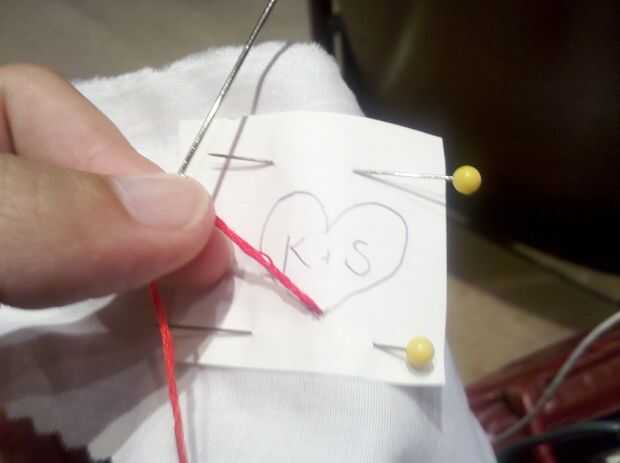 Comenzar a coser! A partir del parte inferior el punto del corazón, poner la aguja (de la parte trasera) a través de la tela y el papel. El hilo debe ser flojo - no duplicado en y anudada al final. Como hay una cantidad razonable de cola, no perder el hilo por la aguja. Llevar la aguja hacia abajo a través del tejido en una puntada de longitud media. Al llegar a la curva del corazón, las puntadas obtendrá un poco más pequeñas para permitir la curva.