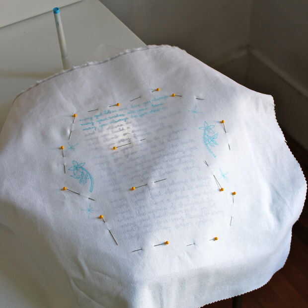 Esto tomó otra hora o así. Después totalmente había firmado el patrón y borra el lápiz, cubrió una pieza de ropa encima. Tuve que ser muy cuidadosa con la fijación por lo que ningún cambio ocurriría. :)