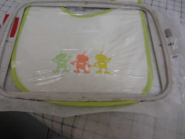 Utiliza estabilizador debajo de ambos y añadió un estabilizador soluble en agua sobre la parte superior del babero puesto que es terry y elástico. Poner agua estabilizador soluble sobre esa combinación lo hace fluir mejor y entonces no tengo que tirar contra el tramo del babero para quitar el estabilizador - lava en el lavadero.