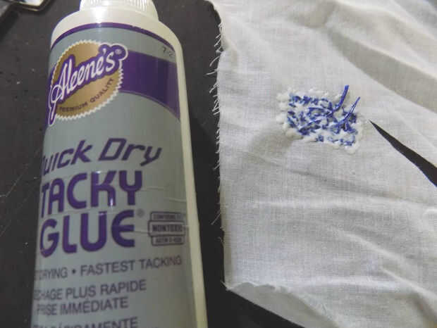 Aplique una capa delgada de pegamento en la parte posterior de la tela a endurecer, hilos e impiden desentrañar al cortar la pieza hacia fuera. Extenderlo uniformemente con un dedo. Deje que se seque.