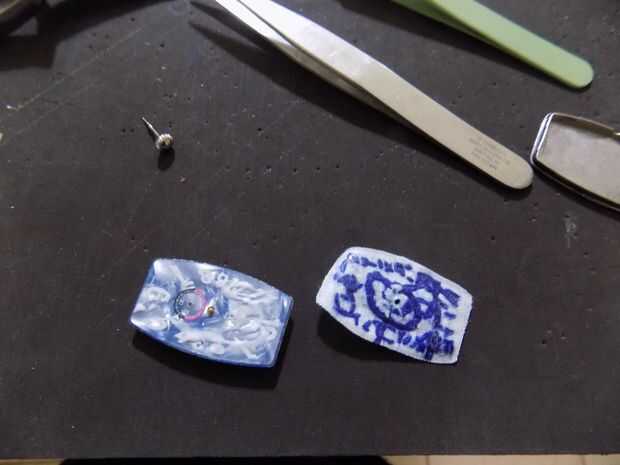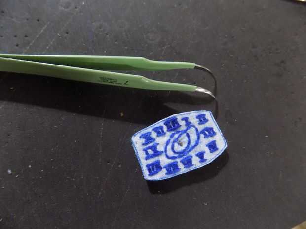 Pegue la cara bordada en la cara viejo haciendo Presione firmemente alrededor del perno en el centro. Presione a la tela plana como sea posible alrededor del perno.