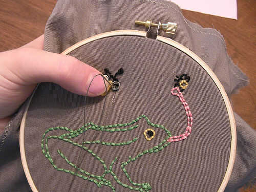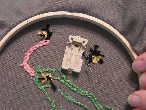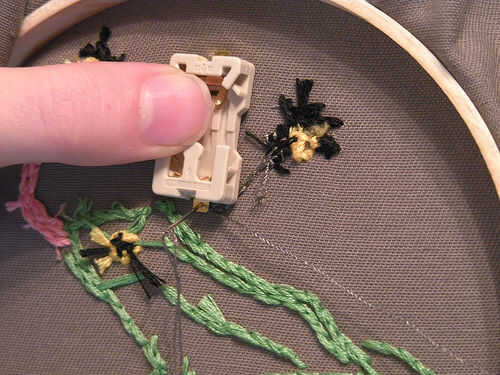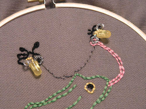 Sin cortar el hilo, coser un camino (aún en pespuntes) a la otra luciérnaga y coser el plomo en espiral cuadrado la misma forma que el primero. Ate el hilo. Entretejido a lo largo de la línea de costura del mismo modo que hacer con el hilo dental regular, luego cortarlo. La razón por la que tejer nuevamente es que al final tiende a deshilacharse, que podría causar un corto circuito si fuera cerca de otro conductor rastro.