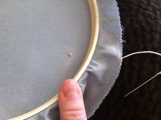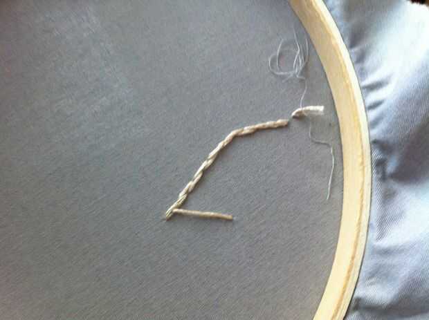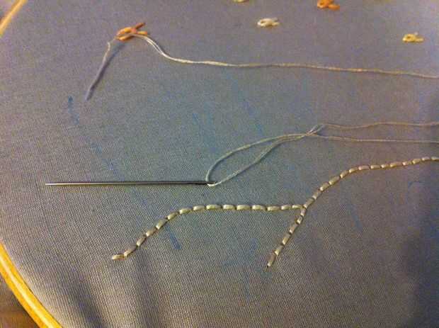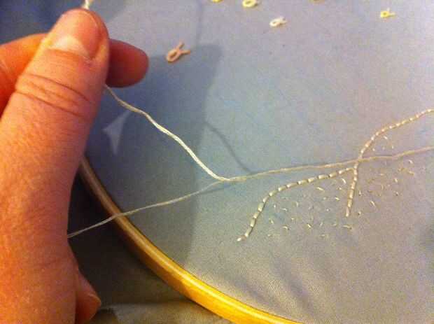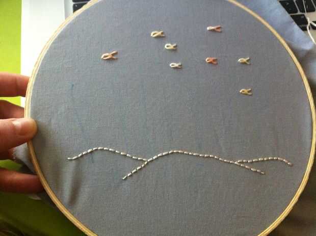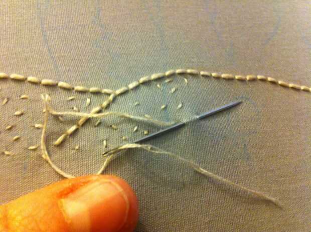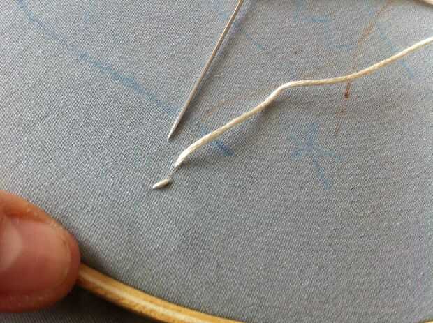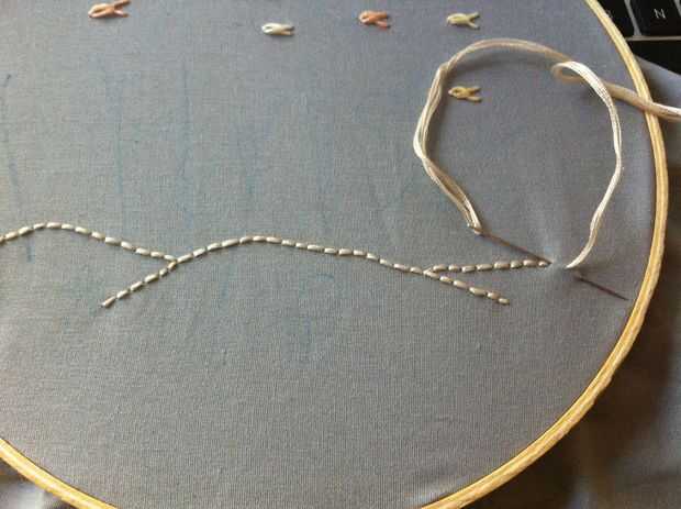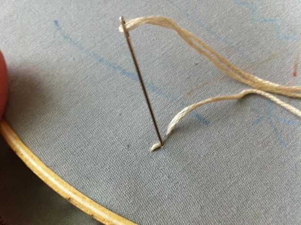 Cosí los contornos de arena con una puntada atrás. Luego cosí poco puntadas individuales con menos hebras de hilo para los detalles en la arena.