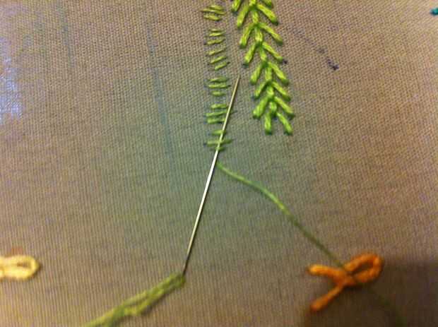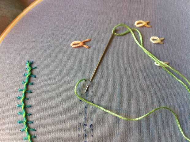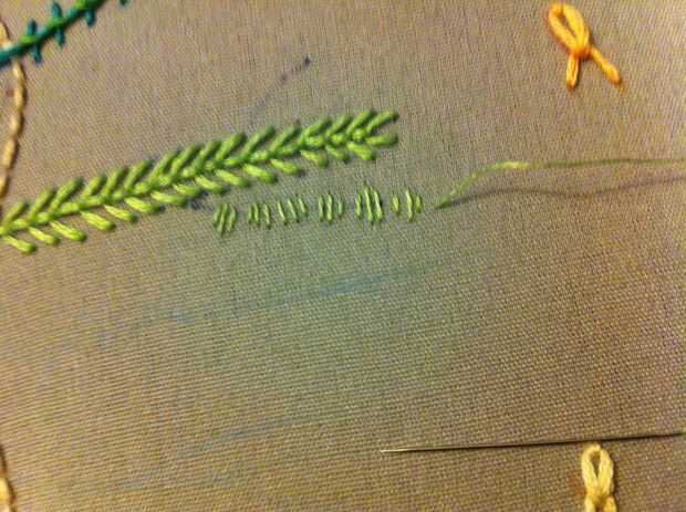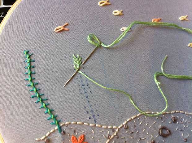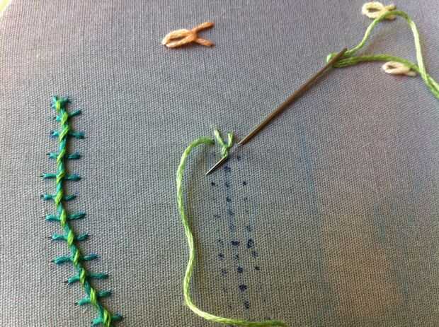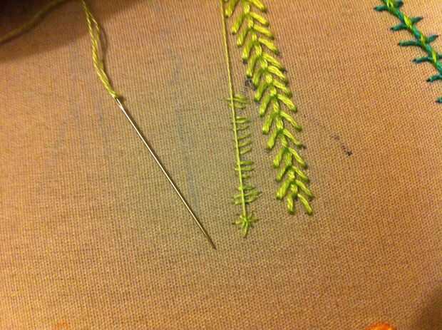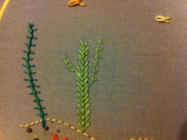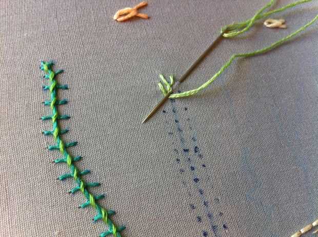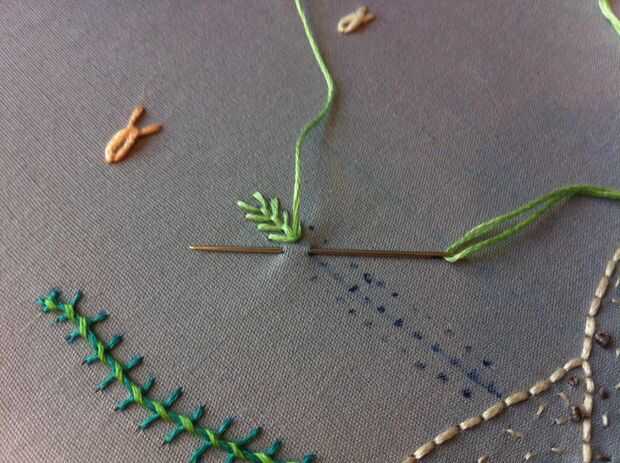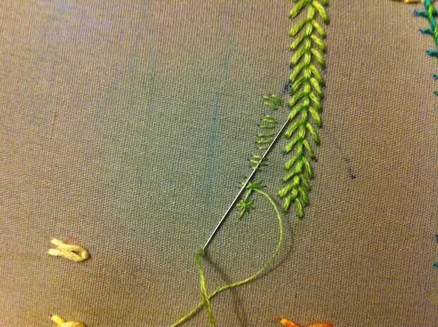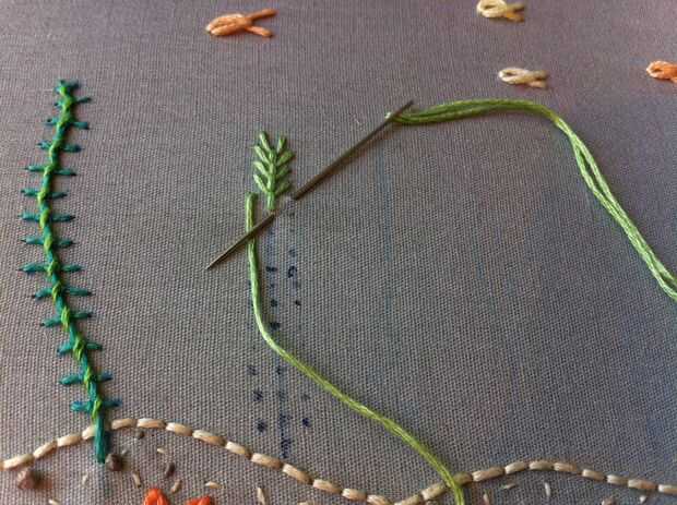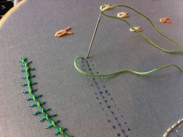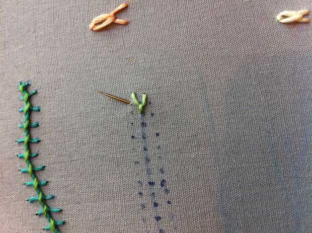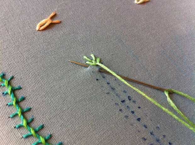 Siguiente filamento de algas es una puntada de la mosca. http://www.embroidery.RockSea.org/Stitch/Fly-Stitch/Fly-Stitch/