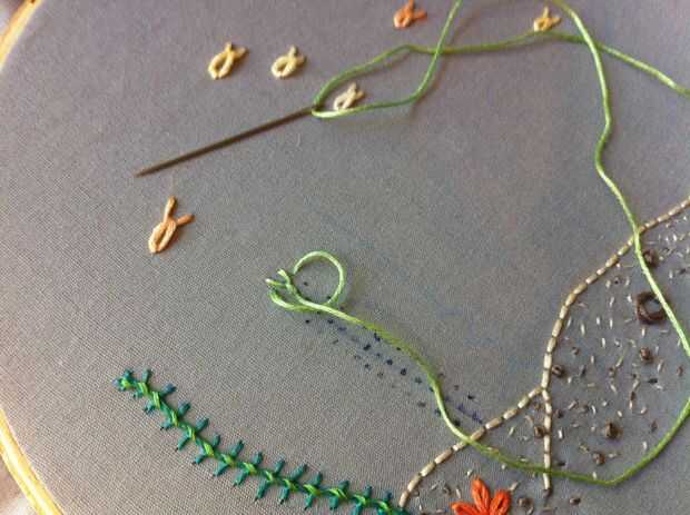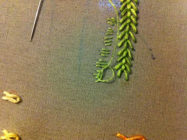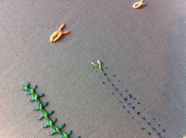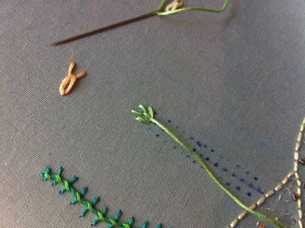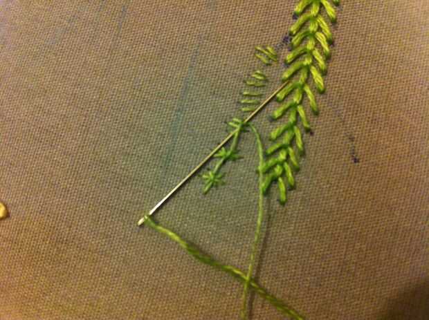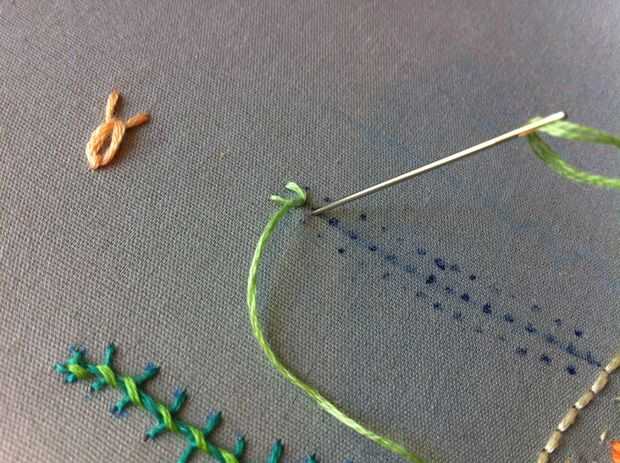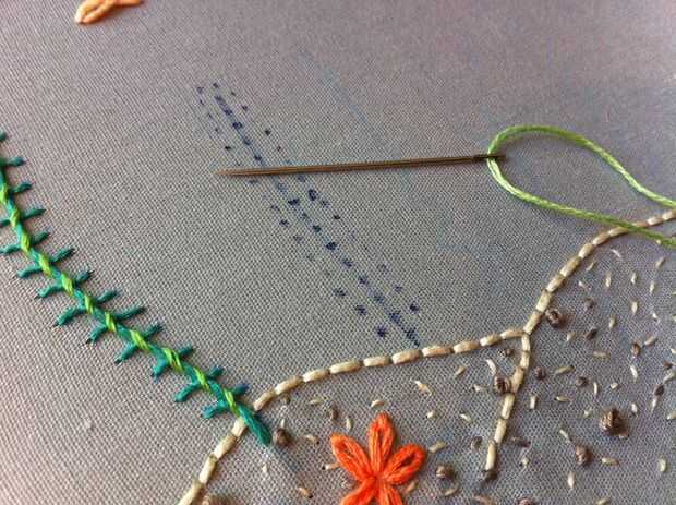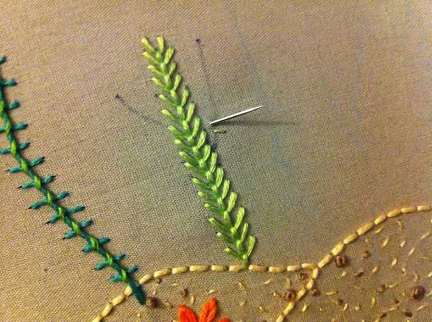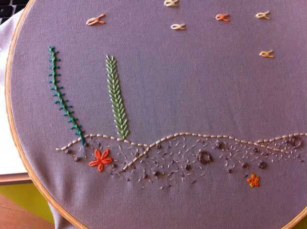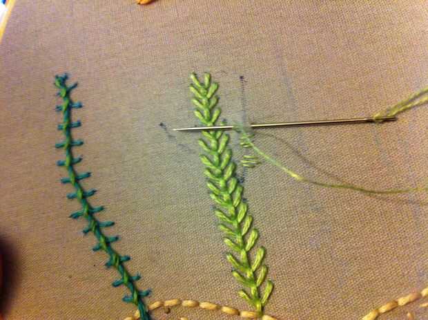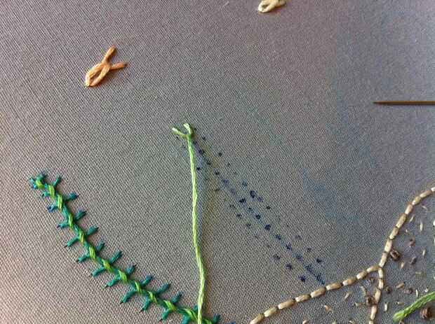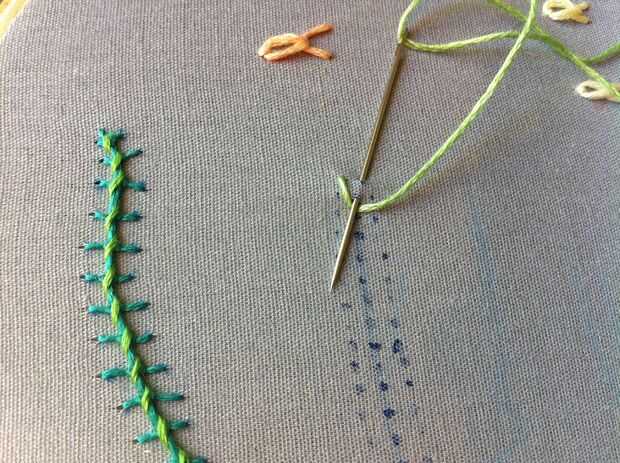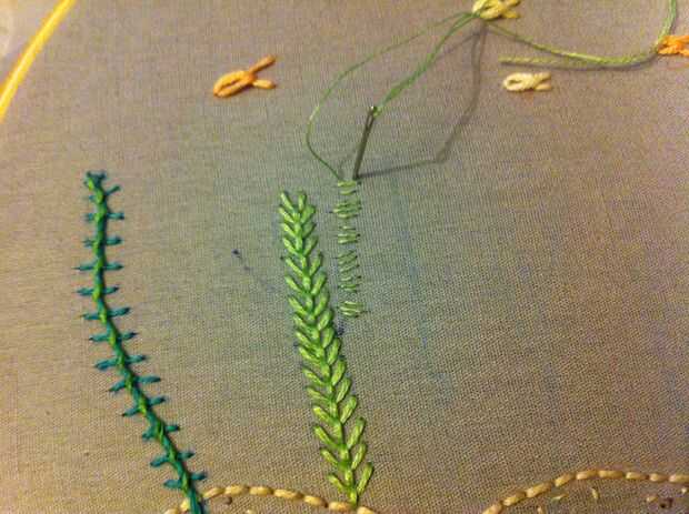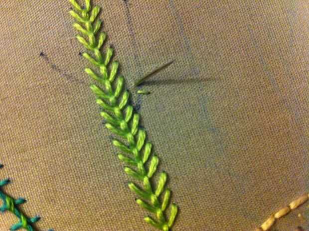 Siguiente filamento de algas es una puntada de la mosca. http://www.embroidery.RockSea.org/Stitch/Fly-Stitch/Fly-Stitch/