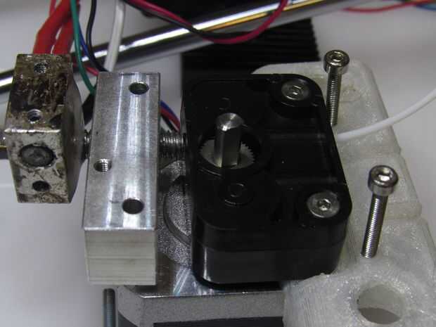La extrusora de MK7 viene ya ensamblada, pero tendrá que desmontar y añadirle un montaje. Para el montaje de la extrusora, hay dos mitades que juntas del perno. Tomar las dos piezas estampadas 3D y dos pernos de 20mm de M3 y tuercas m3 y ponga a un lado. Retire los dos pernos inferiores en la parte delantera de la extrusora y luego retire el ventilador y el disipador de calor. Luego, habrá una parte de negro moldeado por inyección. Retire los dos pernos y levante el pedazo negro. Ahora, la parte impresa 3d que se muestra en la imagen 3 y colocarlo donde estaba la pieza negra y vuelva a colocar la pieza negra en la parte superior la parte impresa 3d.