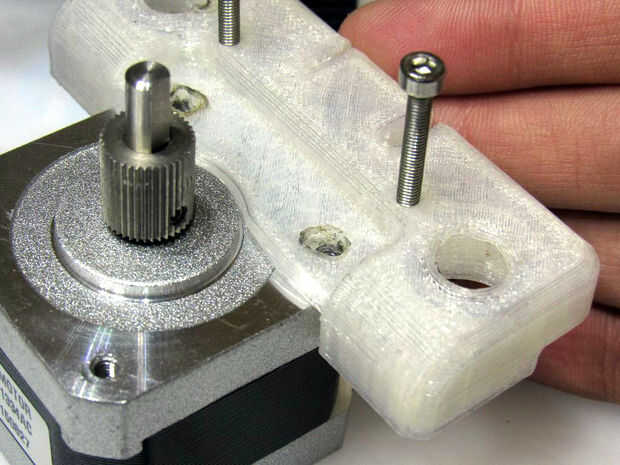 Ahora, vuelva a montar la extrusora todo. Tomar la otra extrusora impresa 3D pedazo de Monte y Coloque 2 rodamientos de LM8UU continuación, colóquela en el otro lado de la pieza de montaje 1 extrusora. Por último, acabado el estirador apretando los dos tornillos de 20mm de M3, asegurándose de que va a través tanto de las piezas de impresión 3D.