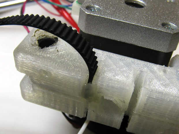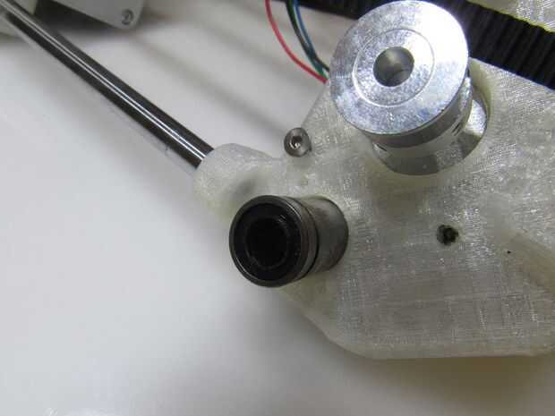 Tomar el eje Y y fijar un motor nema 17 con tornillos de 8mm de M3. Voltee el montaje del motor Y eje y coloque una tuerca de 5/16 pulgadas y ponerlo en el agujero en forma de octágono. Ahora, poner dos rodamientos de LM8UU en los orificios superiores en el Monte. A continuación, instale la polea GT2 en el eje del motor apretando el tornillo de fijación. Asegúrese de que la banda de GT2 está a la altura de la polea. Empuje las barras lineales en la parte delantera de la montura y empuje la montura de la extrusora en la barandilla. Luego, empuje la pieza de "Eje Y conector" sobre las varillas y a continuación, el "eje Y pieza terminal". Para terminar el eje Y, presione la correa sobre el Monte de la extrusora.