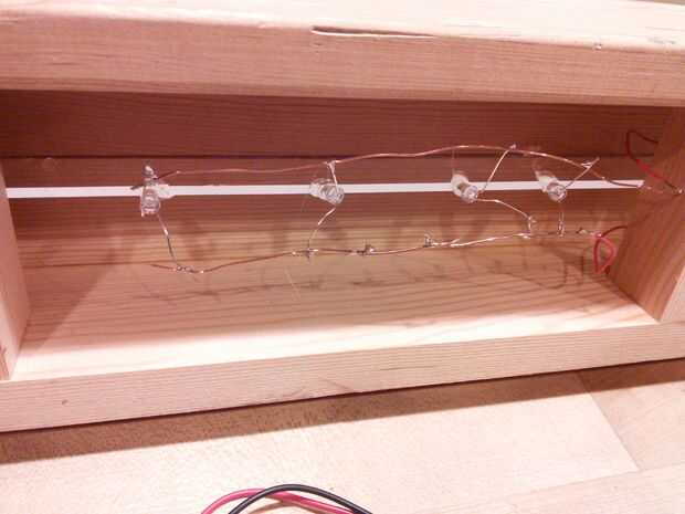 Cortar dos tramos de alambre. Los extremos positivos de los LED los lados negativo al otro cable y un alambre de la soldadura. Luego utilice una pistola de pegamento caliente para pegar el LED para el acrílico.