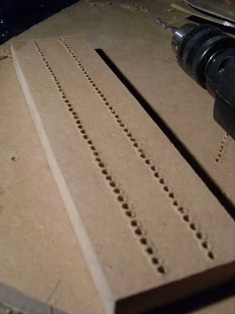 Siguiente paso fue montar ya que muchos de esos LEDs como pude en el espacio que tenía. Pensé que sólo podía ajustar 96 de mi 150 LEDs en el espacio disponible. Así los agujeros perforados en otra pieza de MDF.