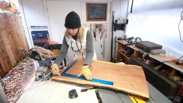 Empecé con la mirada sobre la pieza de madera. Este es muy plana que es agradable por lo que no necesita ninguna articulación, sin embargo muchas veces las losas necesitan una gran cantidad de trabajo para conseguir perfectamente plana. Estoy decidiendo de qué lado debe estar hacia arriba y hacia abajo y ver cuánto difiere el tamaño a cada lado. Para obtener una mejor idea de dónde cortar los lados, estoy marcando una línea, por lo que las dos partes será paralela.