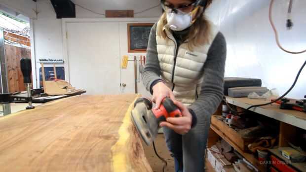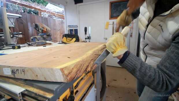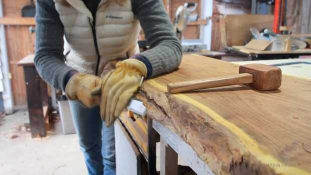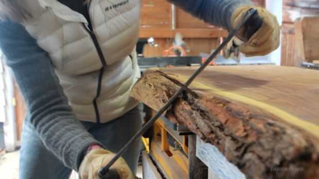 Ahora tiempo para limpiar esta losa encima de un pedacito. Así que este es un pedazo de borde vivo de madera que significa que hay aún corteza izquierda en los lados. Ahora quiero mantener parte de esa naturaleza rústica, sin embargo no quiero corteza suelta cae de la mesa. Así que aquí estoy utilizando un cuchillo de sorteo para quitar corteza suelta. Me aseguré que afilé antes aquí, y es muy divertido hacer este trabajo. Esta es una de mis herramientas favoritas que no me dé una oportunidad para utilice a menudo, por lo que realmente estaba disfrutando esto. Es bastante memorizar y luego decidir cuánto dejar, cómo mucho a despegar. También trajo hacia fuera un cincel aquí seguir a limpiar esto.