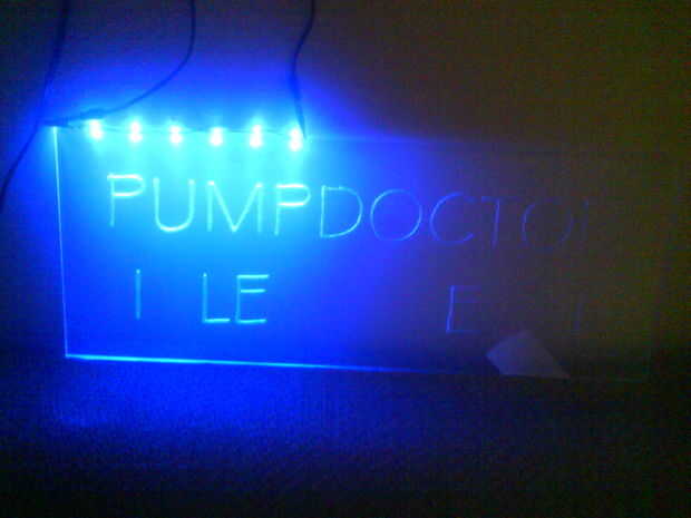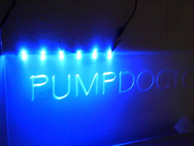 Signo es cartas de 9 "x 24" 2" de altura. Hay 30 13 LEDs 000MCD espaciados 1.5" aparte de unos a otros. Tomó alrededor de 2,5 horas para grabar y otra hora para perforar y soldar los LEDs en grupos de 3 y pegarlos en. LEDs de dibujan un total de alrededor de +-180ma en 12 voltios