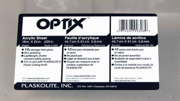 6 - plazas de 3 pulgadas x 3 pulgadas (cortadas de la hoja de acrílico de OPTIX 0.220 pulgadas - en Lowes)