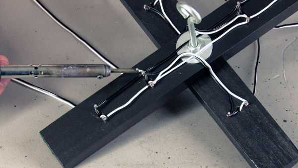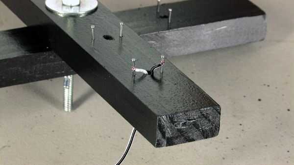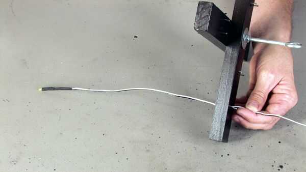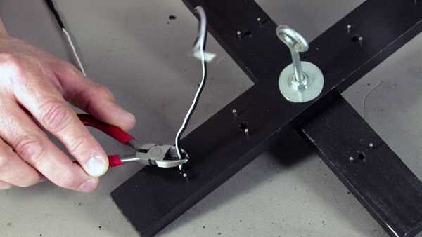 2) hilo de rosca de una de las Asambleas de cable de LED a través de un agujero de la parte inferior del soporte transversal. Determinar qué longitud desea y cortar al otro lado del agujero. Tira un poco de los dos cables y envuélvalos alrededor de las uñas. Esto mantendrá el cable en su lugar.