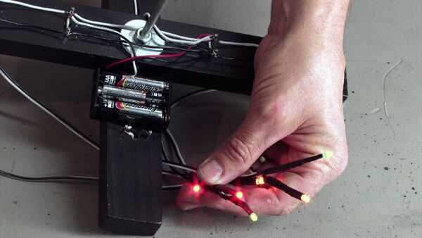 4) una vez que todos los LED son de la longitud deseada y alambre envuelto, conectan todos los positivos juntos y todos los negativos juntos siguiendo el mismo alambre envuelven método. Cuando termine, conecte la fuente de la batería y asegúrese de que todo está conectado correctamente y encienden los LED. Alambre envolver las uñas le dará buen contacto eléctrico por lo que no necesita soldadura para comprobarlo.