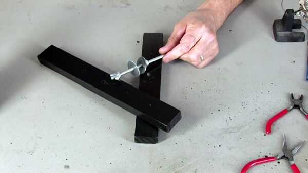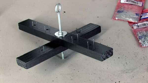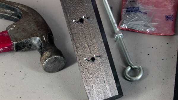 1) Coloque dos clavos en los lados de cada agujero. Estos se utilizarán como alambre de envolturas para mantener los cables y prolijo. Atornille una tuerca en el perno de ojo completamente y deslice una de las arandelas. Coloque la madera para que las uñas se enfrentan a la misma dirección que el ojo de la armella (esto es "arriba"). Deslice sobre la otra arandela y atornille la tuerca de la segunda, luego apriete. En las fotos se dará cuenta que utiliza una tuerca de mariposa (por conveniencia).