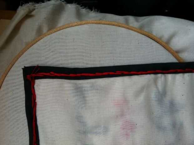 4. usando una aguja de bordado sharp, comienzan a pespunte por el borde del bordado entero. Tratar de ver una película o escuchar un libro en la cinta al hacerlo porque era muy desperdiciador de tiempo. Bordado es F-U-N