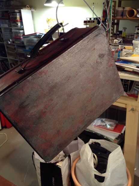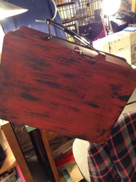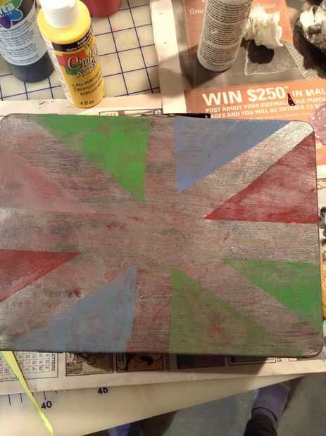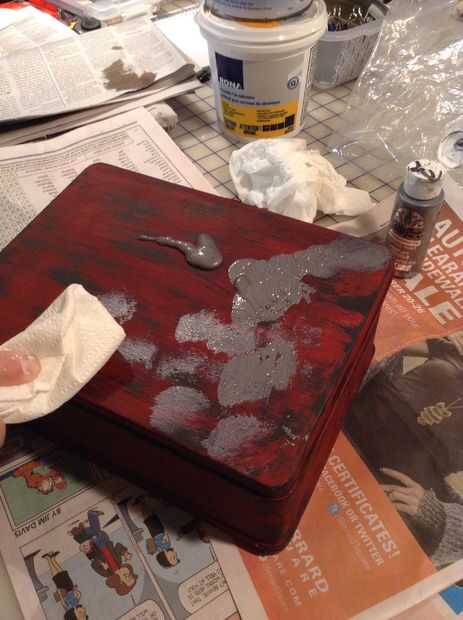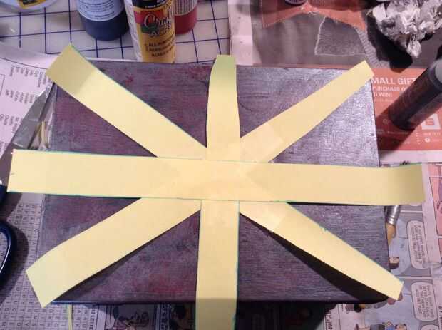 quería empezar con una capa de rojo dificultad para algunos detalles. Dos capas de pintura Burdeos, utiliza un pincel para estarcir con negro para señal de socorro (utilizando la técnica de pincel seco) luego ligeramente la había cubierta con plata. Después de eso, me corte unas tiras de papel e hicieron una cruz cruz de patrón en la tapa. Luego pinté overtop de la tapa con verde, rojo, amarillo, azul y púrpura en su triángulo respectivo. Una vez este seco, pinté claptrap.