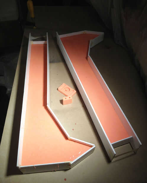 La escultura de Apoxi ha curado y el hacha ya está listo para ser moldeado. Ceba el MDF con Krylon Rust rojo para darle una textura uniforme de la silicona para adherir a. Las cajas de molde están hechas de base de la espuma que se corta sólo para ajuste y apuntalada con pegamento caliente y cinta de embalaje.