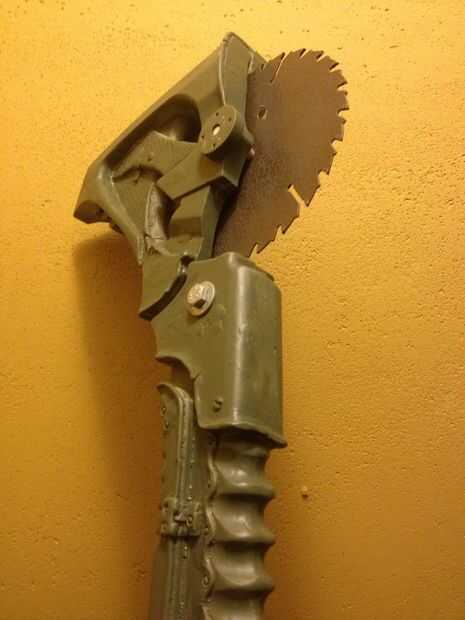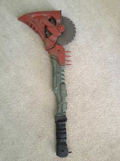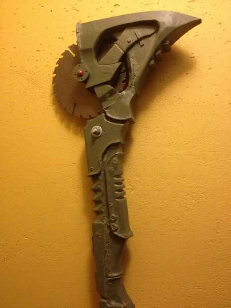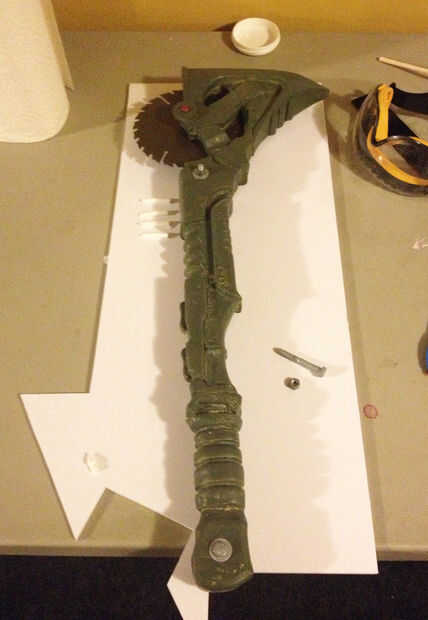 Por lo que el elenco fuera del molde y el ensamblado utilizando Loctite superglue de grado profesional. La manija de la bici y los agujeros de clavo oxidado son perforados hacia fuera usando una prensa del taladro y pegados en su lugar. El molde ensamblado se rocía con un grado de auto grabado de cartilla. Esto va morder la resina fresca un poco para que la pintura se pega un poco mejor a la superficie. La hoja de sierra está cubierta con la serie del metal martillado de krylon para darle cierta textura. El hacha está preparado en la parte superior volver a usar el rojo óxido y el mango está preparado usando sólo negro plano.