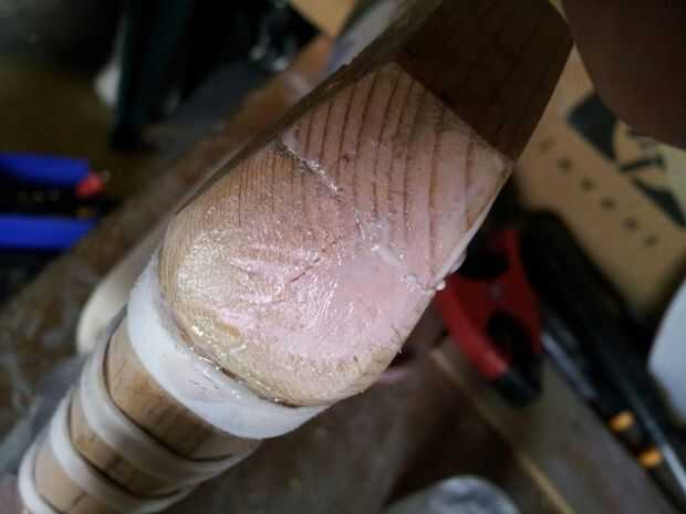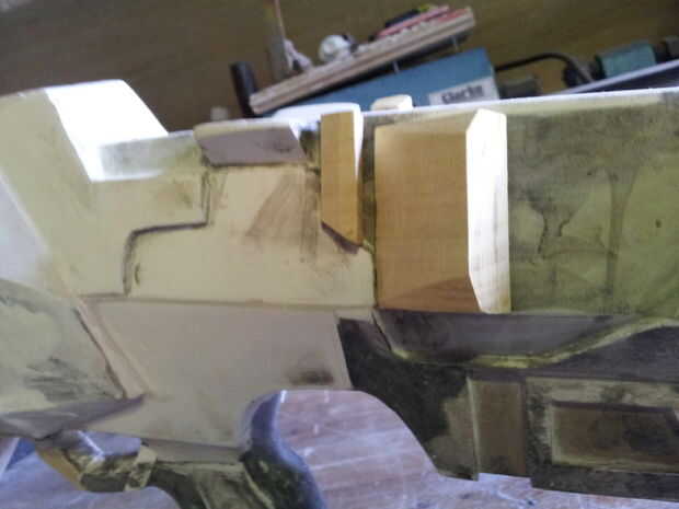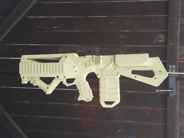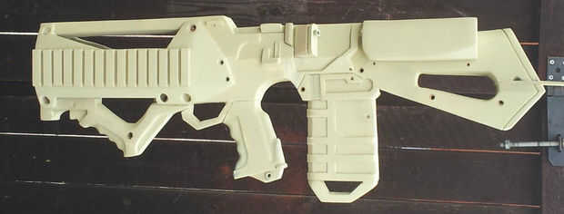Si usted fuera a mirar por el cañón ves una fea carga de relleno y tornillos protuberantes que ligan la pistola. Mi solución fue mezclar la resina de epoxy y el relleno (simplemente porque el relleno es barato y tengo cargas, a diferencia de la resina) y viértala. Esto hizo que una superficie que no tenía que lisa, por lo que era ideal.